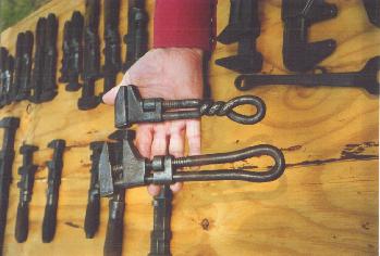 "ACME" (twist handle) & "HERCULES" (loop handle). Both were based on the same February 27, 1883 patent (U.S. patent No. 273,170). (My thanks to Stan Schulz, Editor of the Missouri Valley Wrench Club Newsletter, for correcting my original description of these. He saw them some 4 1/2 years after I posted this page and sent me the info.) Monkey wrenches were named after Charles Monkey.